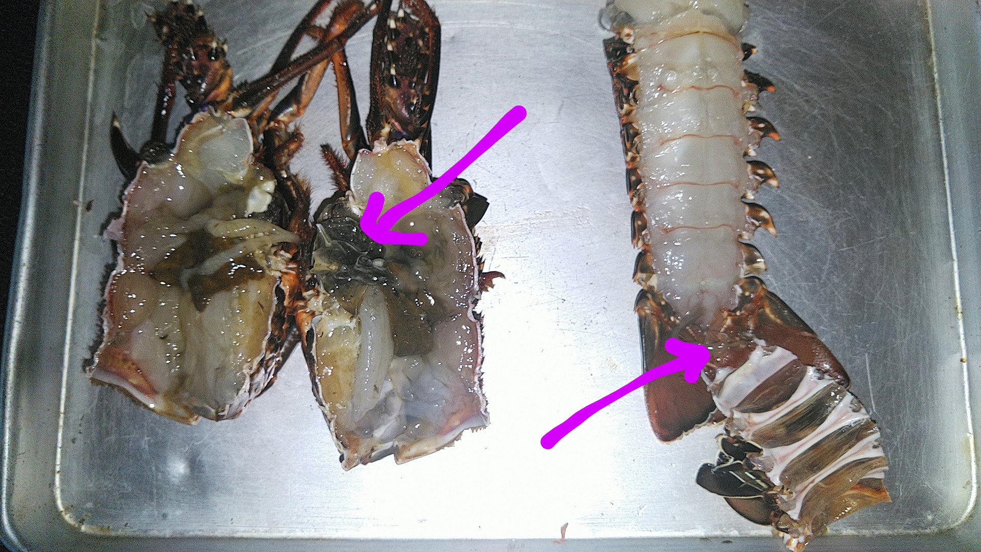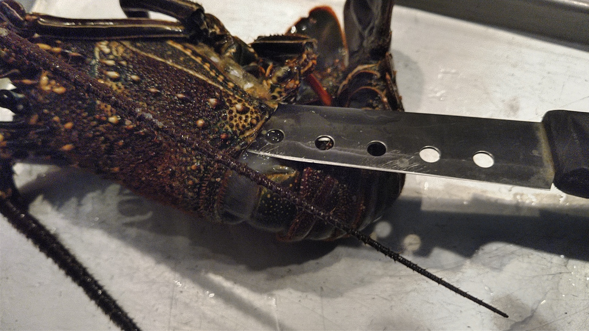 * 解凍した島伊勢海老の頭と尻尾の間にナイフを差し込み一周切り込みを入れ捻るよ