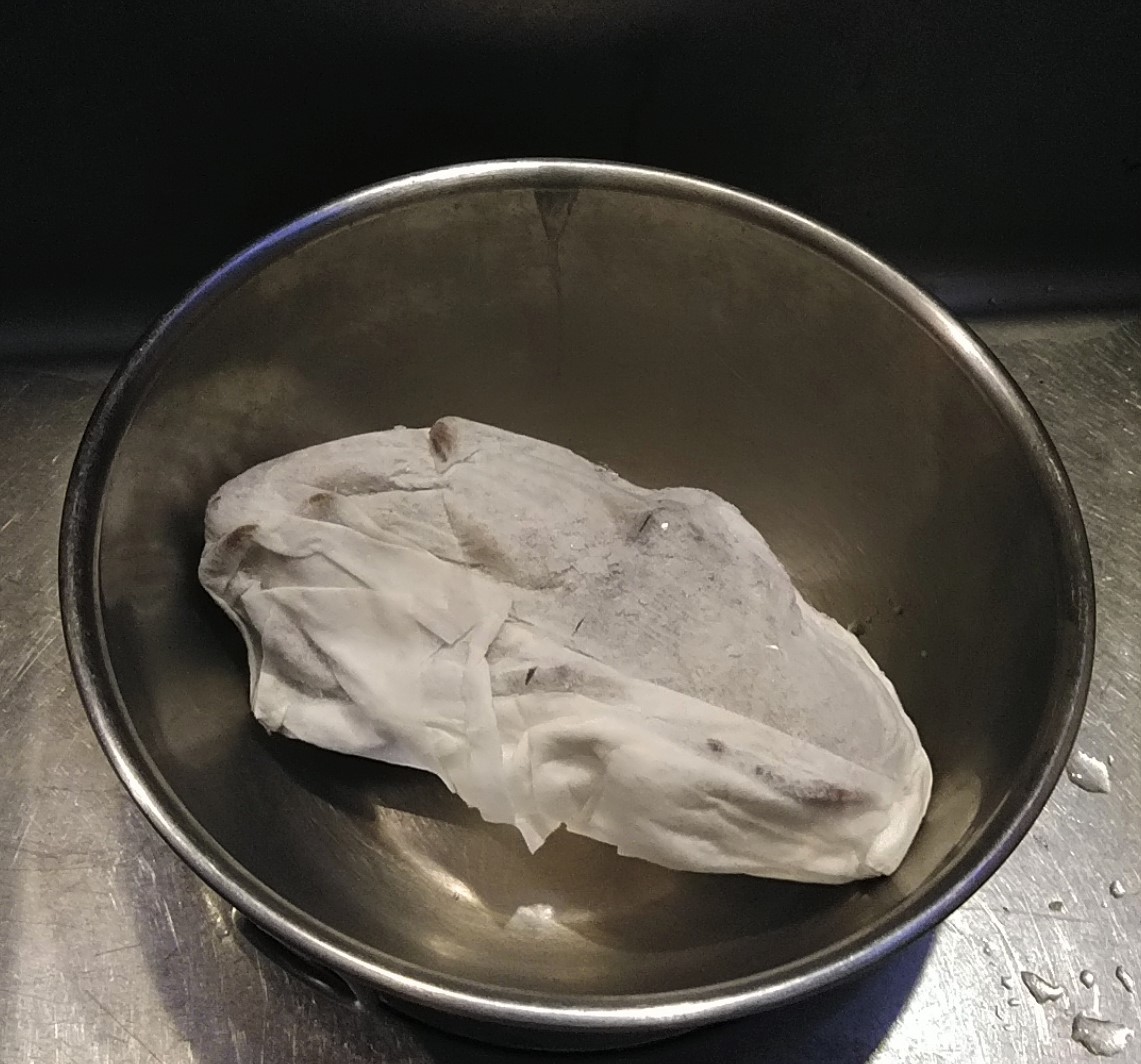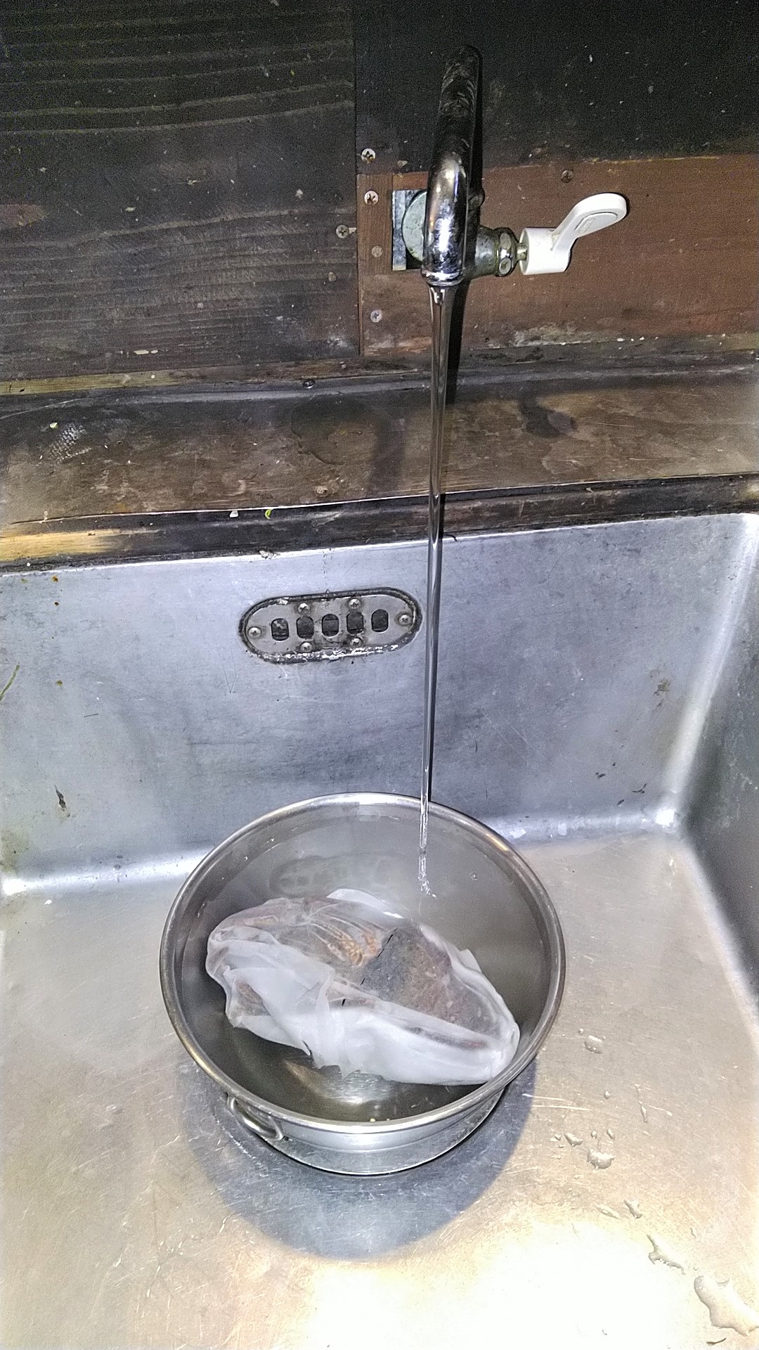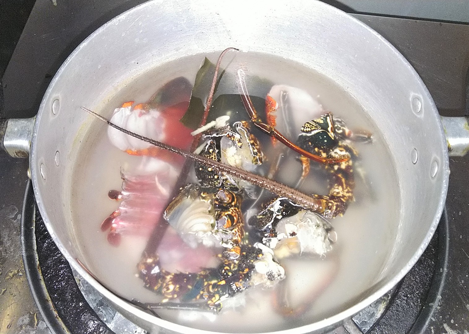 *袋から冷凍島伊勢海老をとりだし、ボールか鍋に入れ水道水を流しながら大きさによって20分から40分解凍します。