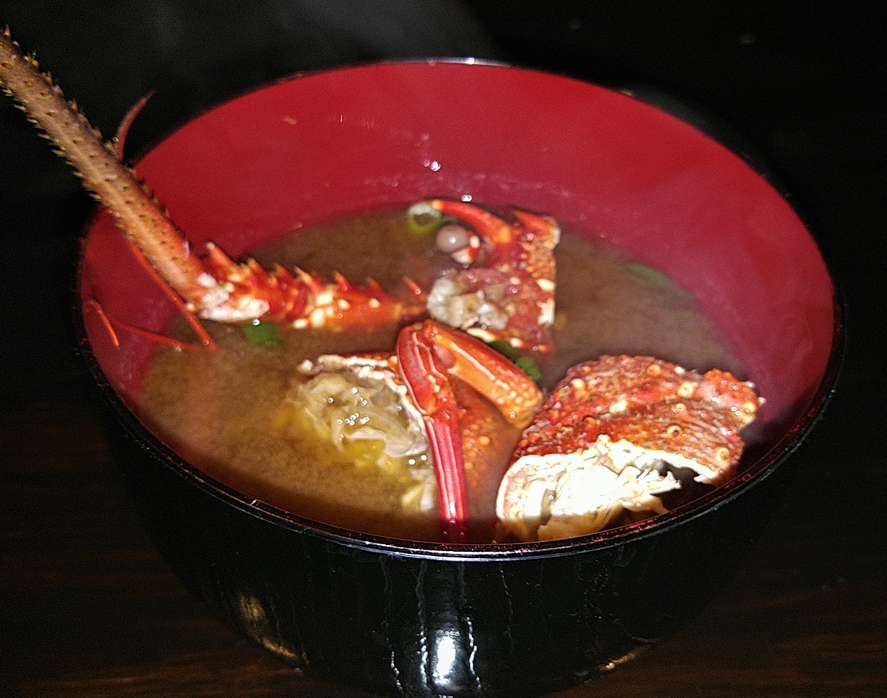 * 刺身に使った頭を半分に割り砂袋を取り出しアラと一緒に鍋に入れ水を適量、千切りショウガ少々、出汁昆布 ¼、お酒 大2を入れ中火で煮、沸騰したら昆布を取り出し弱火で灰汁を取りながら煮ます。15分から20分で伊勢海老の出汁が出て来たら火を止め味噌(宮古島のマルキヨ味噌ベスト)を適量溶きます。アラを器に入れ刻みネギを散らしたら完成です。